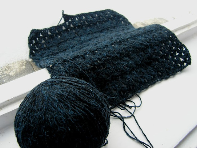 | Tenká černo-modrá šála v šíři cca 30 cm a délce do vyčerpání klubíčka. Práce vhodná do dopravního prostředku. |